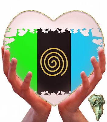 Benawara island ("La Palma" island) is dominated by the colours blue, green and black. Blue represents the surrounding ocean, green represents the abundant plant life (which is the most diverse in the Canary Islands) and black comes from the volcanic rocks that forms the landscape and the numerous beaches of black sand. The pre-Hispanic spiral, in the central section of the flag, represents the Awara God Abora (The Sun). You can see the spiral in our island in rock carvings made by our ancestors - the Awara.